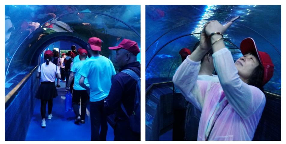 在长达百米的幽蓝色的海底隧道中,学员们仿佛置身于海洋星球之中,感受着被各类海洋生物环抱的沉浸式体验,惊叹于海洋的深邃与广阔。